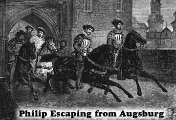 that perhaps all the Protestant princes might decide to leave left him very unsettled. He resolved that at all costs, their leaving must be prevented. To prevent such a flight, the emperor gave orders over night to have the gates watched, but before the order was issued, Philip donning a disguise had already slipped out the gate at dusk and attended by a few horsemen had ridden away.