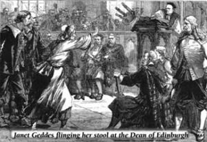 On that Sunday morning, the reader appeared in the desk of St. Giles’ and went over the usual prayers. Having ended, with tears in his eyes he turned to bid the people good-by, informing them that this was likely the last time he would ever read prayers in the church. At the stated hour, he was followed by the Dean of Edinburgh who appeared to institute the new services. As the dean, Liturgy in hand, worked his way to the desk, the scene became more animated. Scarcely had he begun to read when his composure was shaken by the whiz of a missile passing dangerously close to his ear. Tradition tells us that Janet Geddes, who kept a stall on the High Street, finding nothing more convenient, flung her stool at the dean, with the rebuke, “Villain, dost thou say mass at my lug?” Ibid., 542. The dean hastily shut the obnoxious book and fled with all speed. Thinking that perhaps his greater dignity would effect to gain the reverence of the people, the Bishop of Edinburgh ascended to the desk. His appearance, however, was the signal for a renewed tempest with a ferocity that was greater than the first. He managed to escape, the magistrates escorting him home to protect him from the fury of the mob.