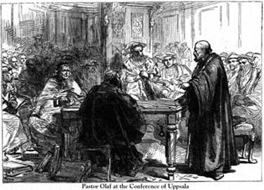 Olaf Patersen undertook at once the Protestant defense but there was some difficulty in finding a champion on the Popish side. The challenge had come from the bishops, but no sooner was it taken up than “they framed excuses and shuffled. At length Peter Gallus, Professor of Theology in the College of Uppsala, and undoubtedly their best man, undertook the battle on the side of Rome.